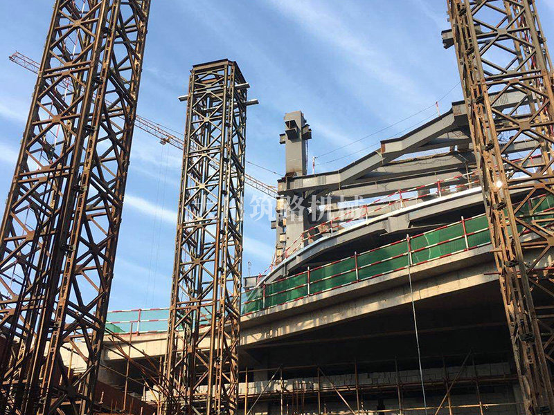 基本情況:部分構件工廠組裝好,分片運輸至現場。采用4片321型貝雷片組合而成的貝雷方柱作為大跨度鋼桁架下部的臨時支撐胎架,待上部鋼桁架安裝完成后分級卸載,最后分片拆除。拆卸后鋼桁架撓度符合要求。貝雷方柱支撐胎架高度達20m,支撐荷載約50t。